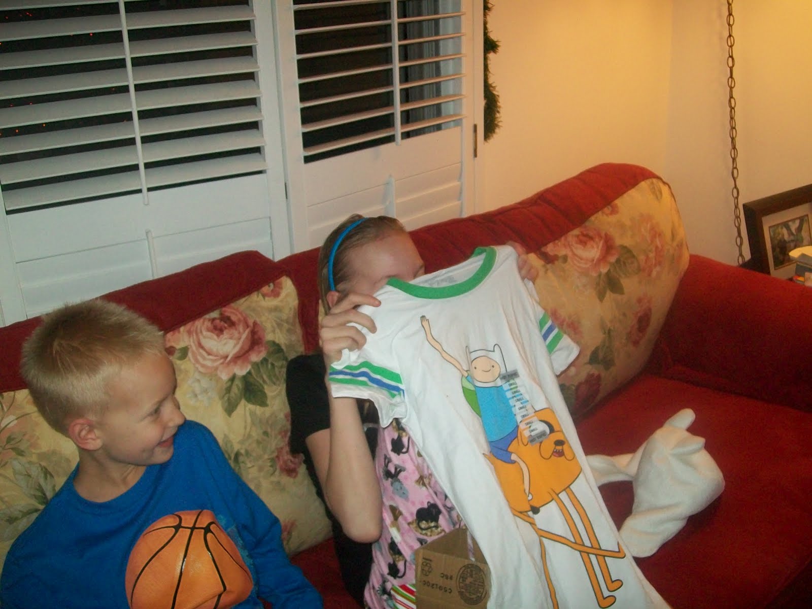 Brandon had Darby.......He had a little help from Miss Anna. She custom made a "Finn" hat from the Cartoon Adventure Time to go with the shirt he got her. You can tell she didn't really like it. ;)